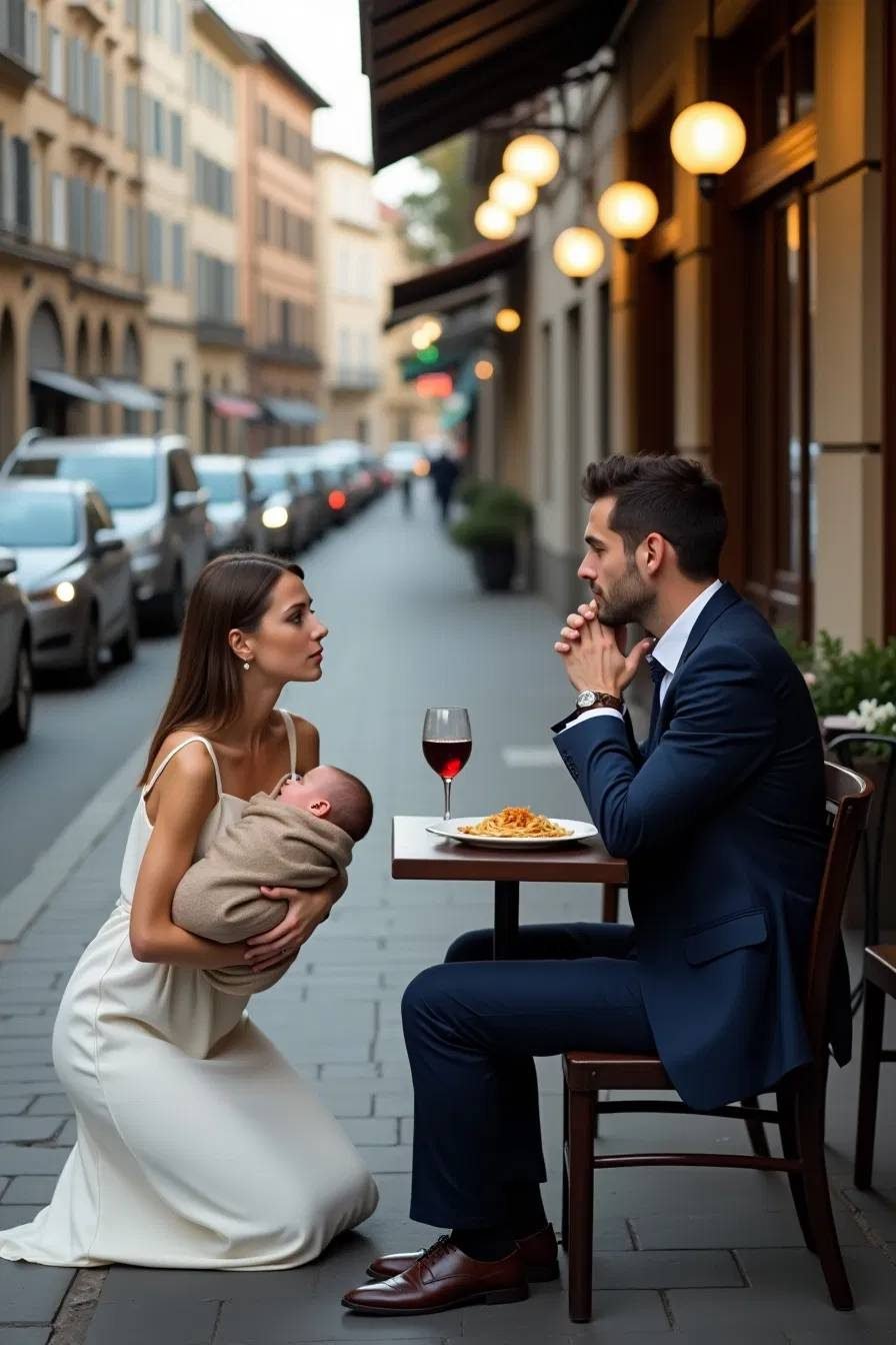 On the concrete sidewalk, bare knees pressed against the cold stone, a flimsy garment with grime and disintegrating threads. She wore a sloppy bun. A infant under a worn brown blanket was in her arms.