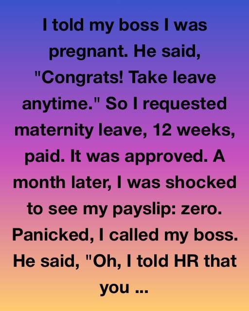 I told my boss I was pregnant. He said, “Congrats! Take leave anytime.” So I requested maternity leave, 12 weeks, paid.
