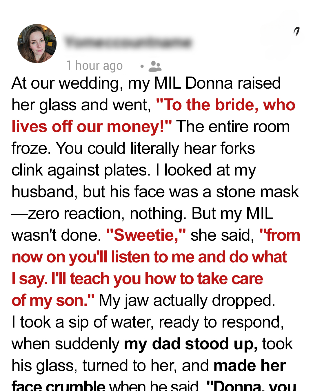 I thought my wedding day was absolutely perfect — until my mother-in-law stood up to give a toast.With a bright smile, she raised her glass and said, “To the bride, who lives off our money!”The room fell silent. My cheeks burned as nearly 200 guests turned to