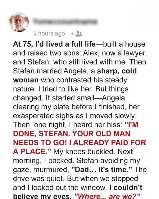 Angela had grown increasingly frustrated living with her father-in-law, Gektor. One evening, she gave Stefan, her husband, a painful ultimatum: “Send your father to a nursing home, or I leave.” Stefan was torn between his love for his wife and his loyalty to his aging father. The next morning, Stefan packed a bag and quietly told his father they were going for a drive.