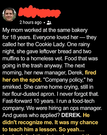 He didn’t recognize me. During the interview, he even bragged about his “tough management style,” recalling how he once fired “an older lady” for giving away food. He thought it showed strength.