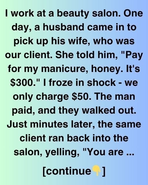 I work at a beauty salon. One day, a husband came in to pick up his wife, who was our client. She told him, “Pay for my manicure, honey. It’s $300.” I froze in shock—we only charge $50. The man paid, and they walked out. Just minutes later, the same client ran back into the salon, yelling, “You are a liar!”