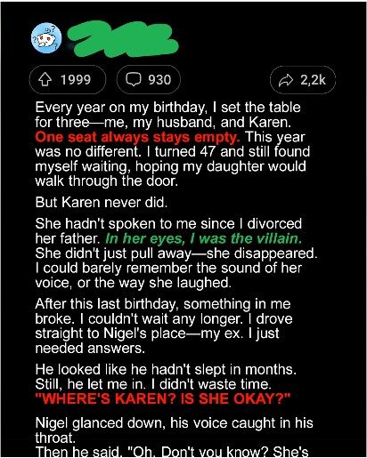 On my 47th birthday, I set the table for three—just like I had every year since Karen walked out of my life. For two long years, her seat stayed heartbreakingly empty. No phone calls. No messages. Just a silence that slowly hardened into grief I carried daily.Every empty chair, every quiet evening, was a reminder of the daughter I once held so close.