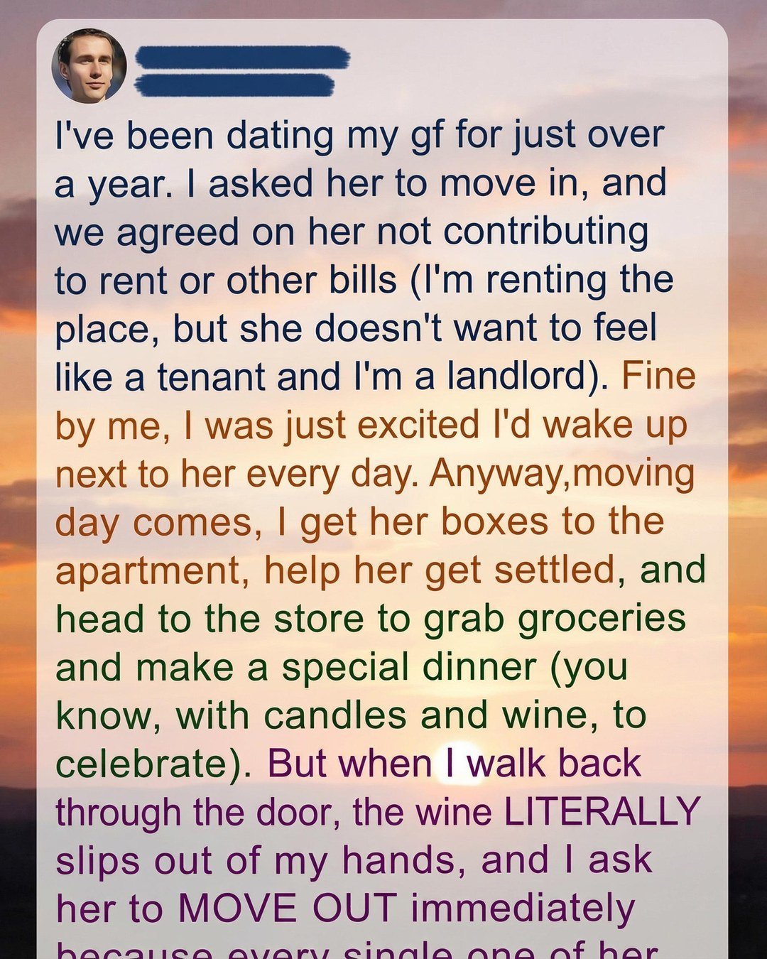 But when I walk back through the door, the wine literally slips out of my hands, and I ask her to move out immediately because every single one of her boxes is completely empty. Instead of unpacking her belongings, she had used the time to rearrange the entire apartment, replacing my furniture, my decorations, and even the layout I had lived with for years.