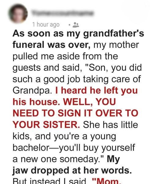 As soon as my grandfather’s funeral was over, my mother pulled me aside from the guests and said, “Son, you did such a good job taking care of Grandpa. I heard he left you his house. WELL, YOU NEED TO SIGN IT OVER TO YOUR SISTER. She has little kids, and you’re a young bachelor—you’ll buy yourself a new one someday.”
