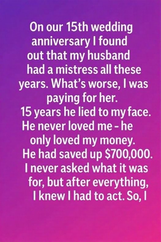On our 15th wedding anniversary, I discovered a truth that shattered everything I thought I knew. For all those years, my husband had been secretly supporting another woman—and without realizing it, I had been paying for every part of their hidden life. Fifteen years of smiles, conversations, and shared moments suddenly felt like a carefully constructed illusion.