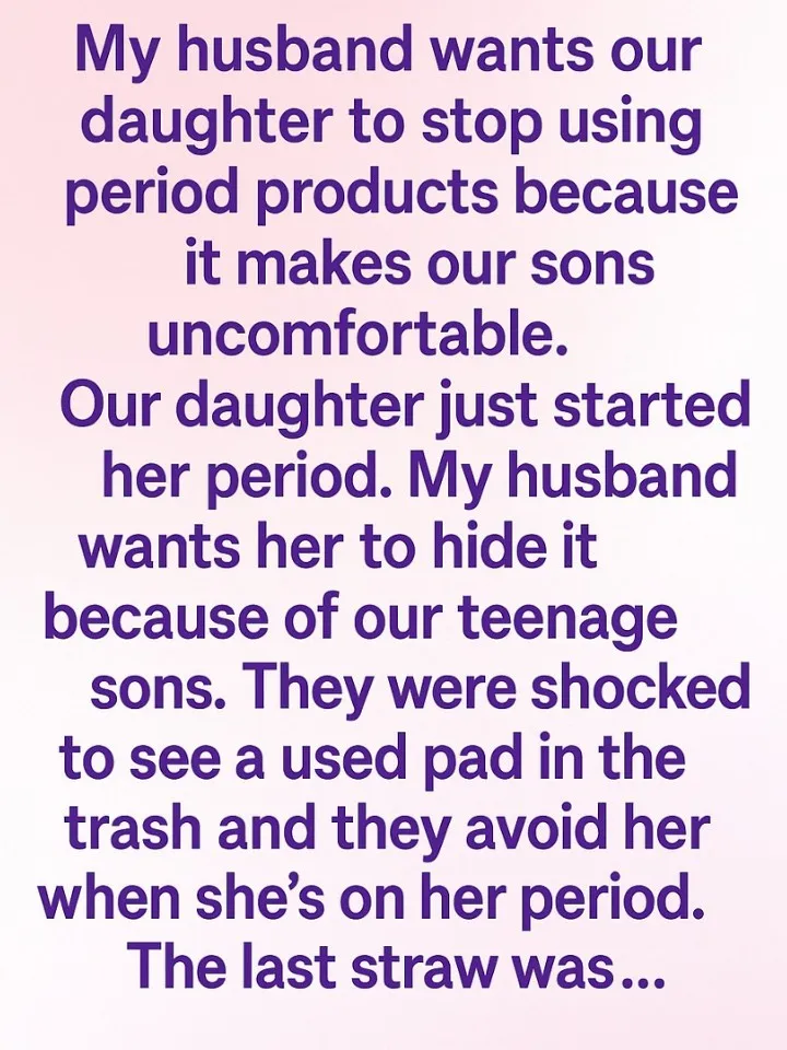 The worst moment came when my husband quietly suggested she stay in her room until her period “was over,” so the boys wouldn’t feel awkward. I watched my daughter shrink into herself, her shoulders heavy with shame for something natural and unavoidable.