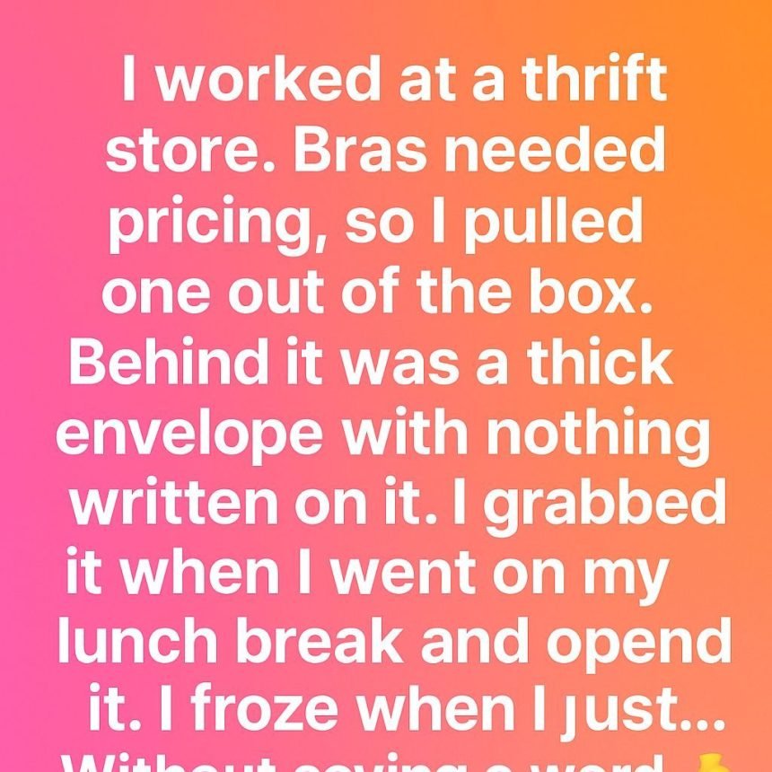 I worked at a thrift store. Bras needed pricing, so I pulled one out of the box. Behind it was a thick envelope with nothing written on it.