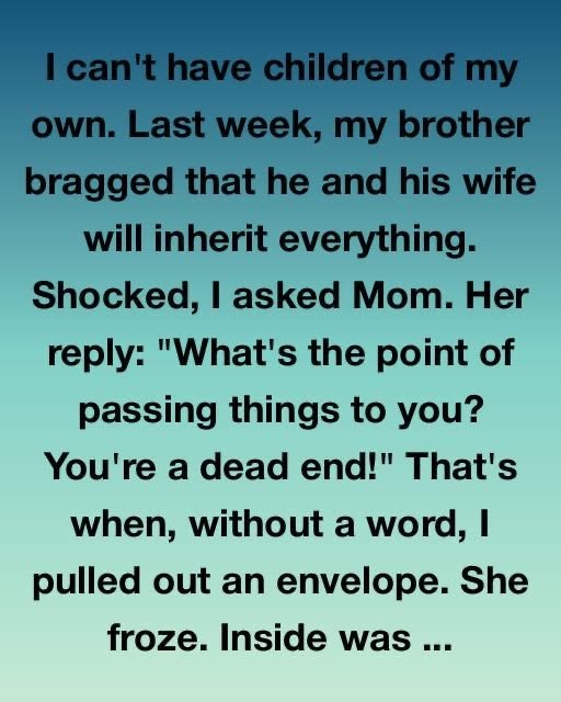 can’t have children of my own. Last week, my brother bragged that he and his wife will inherit everything. Shocked, I asked Mom.