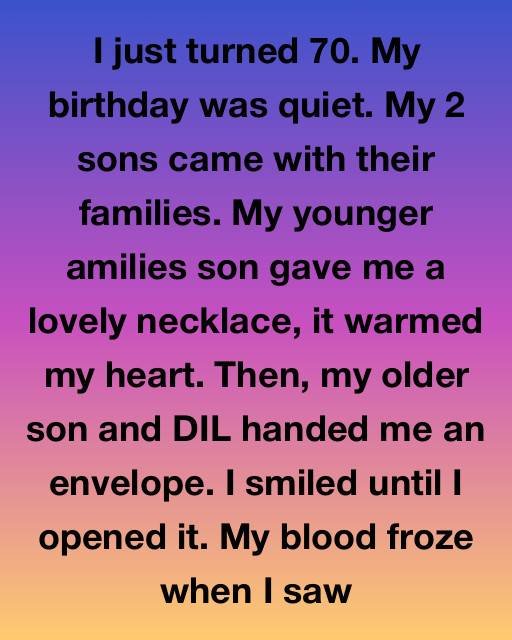I just turned 70. My birthday was quiet, held at my small, cozy home in rural New Hampshire. After losing my husband, Richard, five years ago, I valued the simple, peaceful life I had built, defined by my garden and the occasional visits from my children.