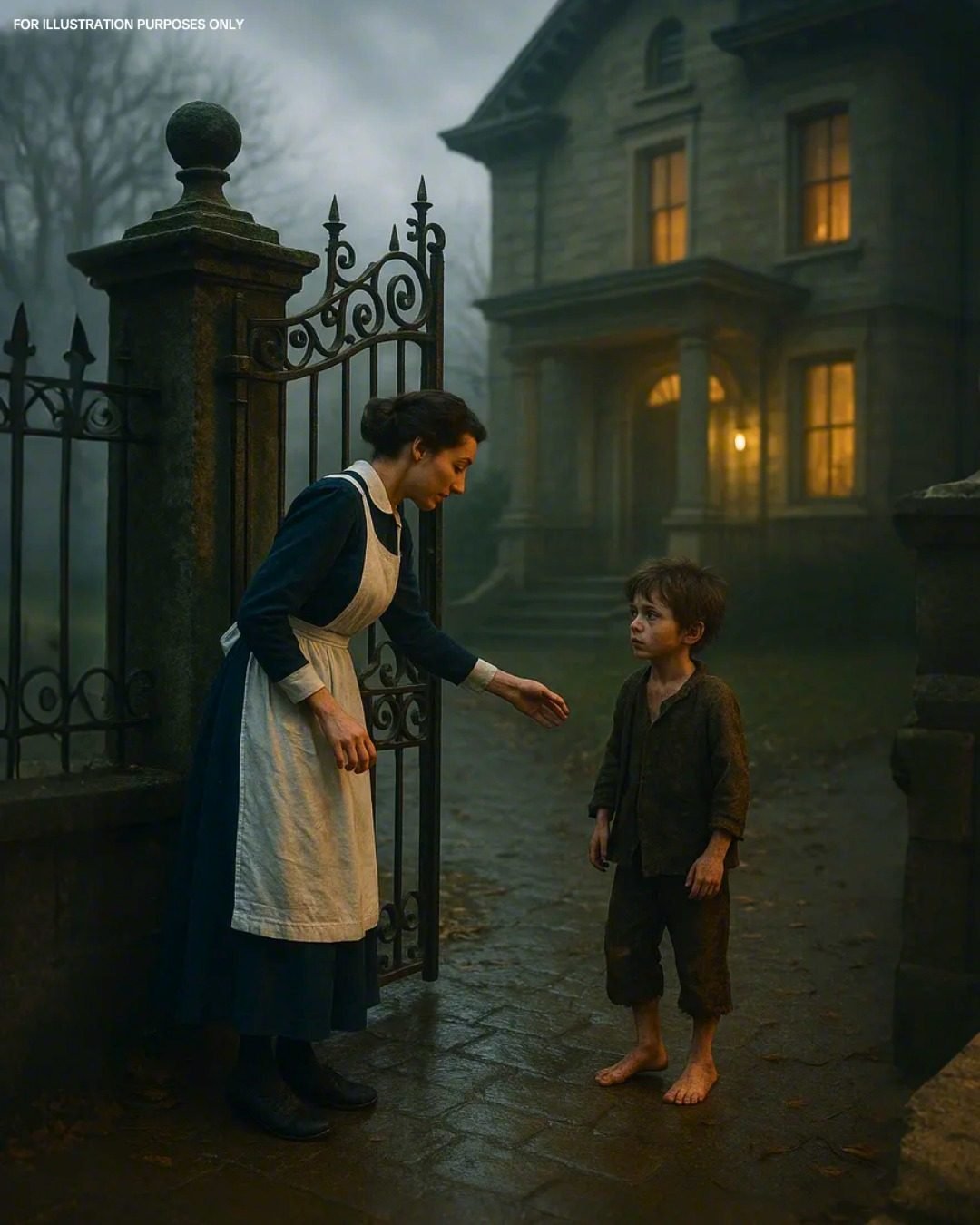It was a boy—barefoot, shivering, his clothes little more than patched rags. His cheeks were smudged with dirt, and his eyes, wide and hollow, stared toward the mansion with a hunger Maria could feel in her bones.