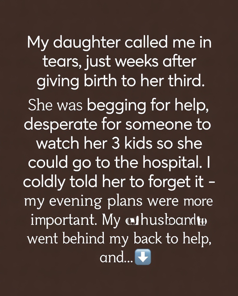 My daughter called me in tears, just weeks after giving birth to her third child. She was begging for help, desperate for someone to watch her kids so she could go to the hospital. I coldly told her to forget it — I had evening plans, and I convinced myself she was exaggerating. But my husband quietly slipped out the door to check on her anyway.