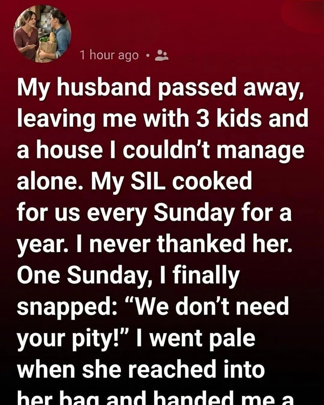In the middle of all that quiet struggle, my sister-in-law showed up every Sunday without fail—arms full of groceries, meals prepared, and a calm presence I never asked for but always accepted. At first, I told myself it was temporary. Just a few weeks of help until I found my rhythm again.