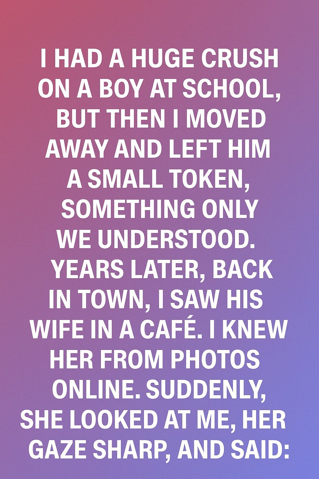 I had a huge crush on a boy at school, but then I moved away and left him a small token, something only we understood. Years later, back in town, I saw his wife in a café. I knew her from photos online.