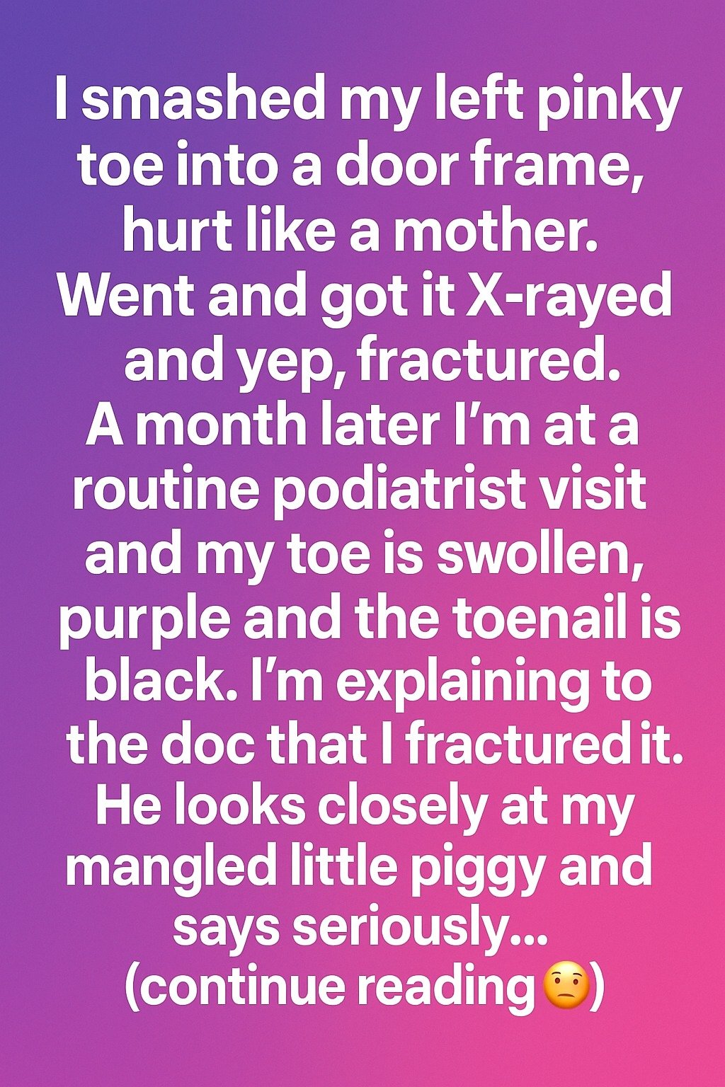 I smashed my left pinky toe into a door frame, hurt like a mother. Went and got it X-rayed and yep, fractured. A month later, at a routine podiatrist visit, my toe was still swollen and purple, and the nail had darkened.