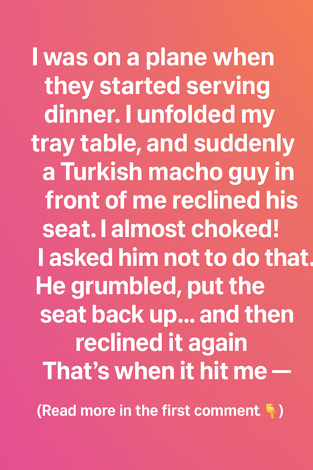 I was on a plane when the crew started serving dinner. I unfolded my tray table, ready to enjoy my meal, when suddenly the man in front of me reclined his seat without warning. My drink almost spilled, and I felt a wave of irritation.