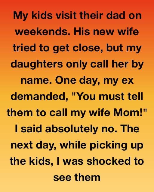 My kids visit their dad on weekends. His new wife tried to get close, but my daughters only call her by name. One day, my ex demanded, “You must tell them to call my wife Mom!” I said absolutely no.