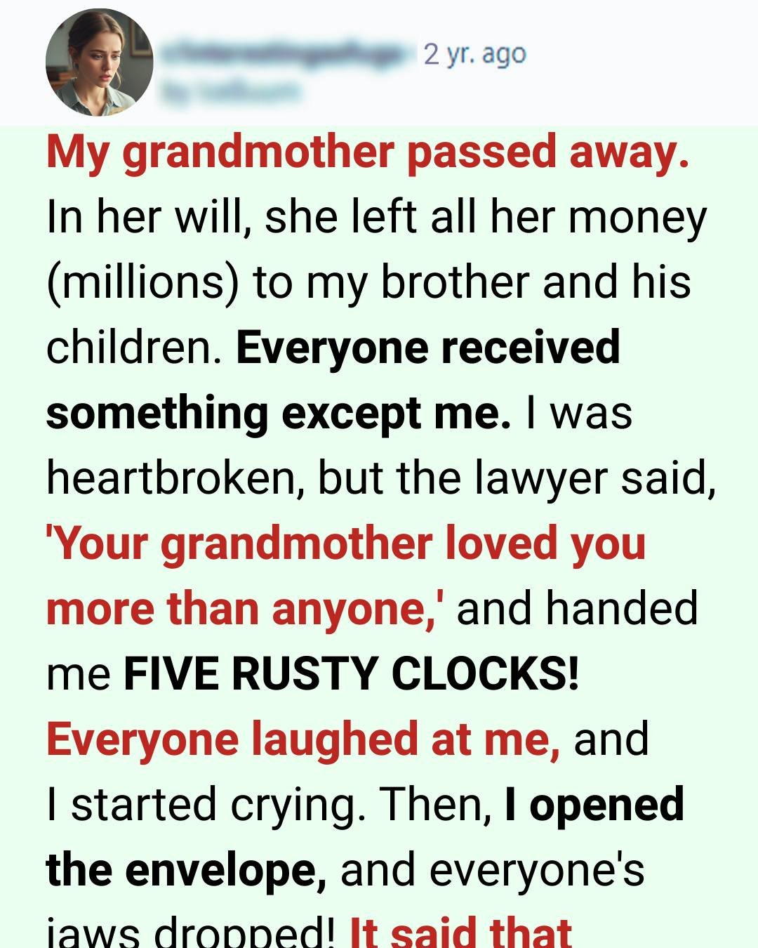 Suddenly the rusty clocks didn’t look so ridiculous. I remembered polishing them with her when I was a child, the stories she told, the afternoons we spent together while the rest of the family was “too busy.” I remembered how she always smiled at me with a secret warmth no one else seemed to earn. She knew what she was doing.