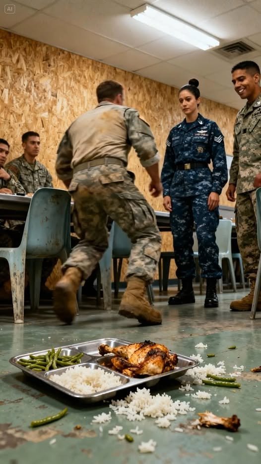 His hand, quick as a striking snake, shot out and slapped the side of her tray. The plastic clattered violently, sending a spray of rice, grilled chicken, and green beans scattering across the dusty floor.
