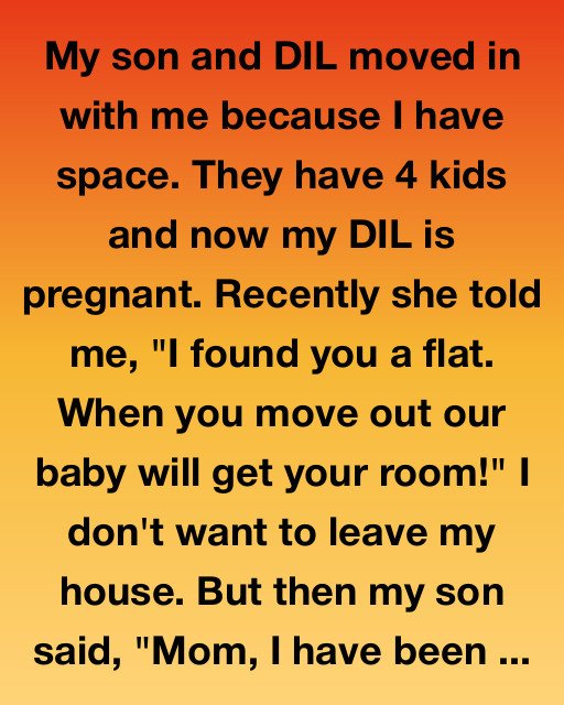 My son and DIL moved in with me because I have space. They have 4 kids and now my DIL is pregnant. Recently she told me, “I found you a flat. When you move out, our baby will get your room!” I don’t want to leave my house. But then my son said, “Mom, I have been paying attention to how unhappy you’ve been… and I think we need to talk.”