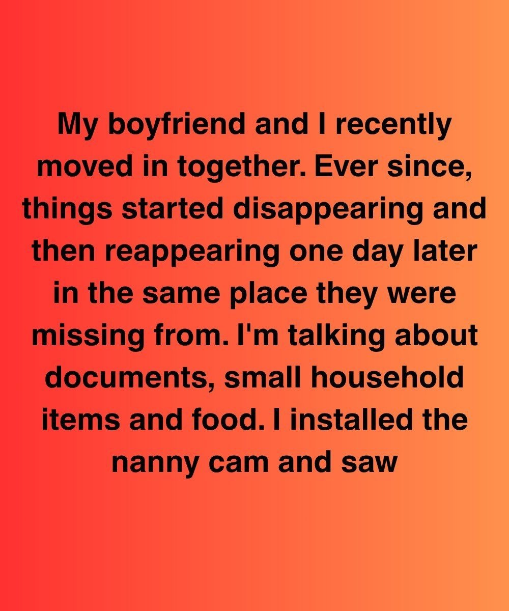 My boyfriend and I recently moved in together. Ever since, things started disappearing and then reappearing one day later in the same place they were missing from. I’m talking about documents, small household items, and food. I installed the nanny cam and saw…