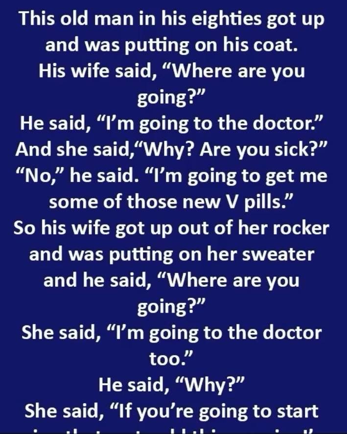And she said,“Why? Are you sick?” “No,” he said. “I’m going to get me some of those new Via4ra pills.” So his wife got up out of her rocker and was putting on her sweater and he said, “Where are you going?”She said, “I’m going to the doctor too.” He said, “Why?”