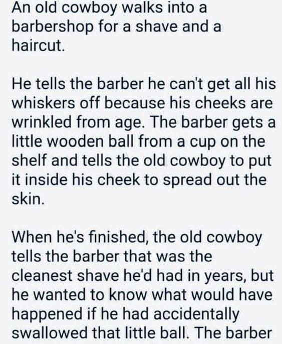 When he’s finished, the old cowboy tells the barber that was the cleanest shave he’d had in years, but he wanted to know what would have happened if he had accidentally swallowed that little ball.