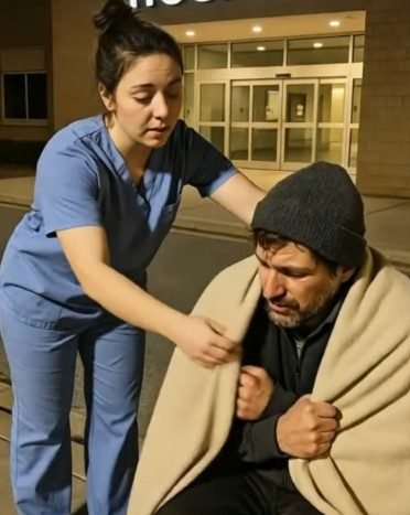 Ava hesitated—then slipped off the clean blanket she always kept in her locker and walked over. “You’ll freeze out here,” she said softly, draping it around his shoulders. He looked up slowly, like no one had spoken to him kindly in years.