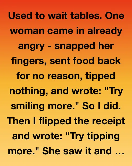 Used to wait tables. One woman came in already angry – snapped her fingers, sent food back for no reason, tipped nothing, and wrote: “Try smiling more.” So I did. Then I flipped the receipt and wrote: “Try tipping more.” She saw it and froze.