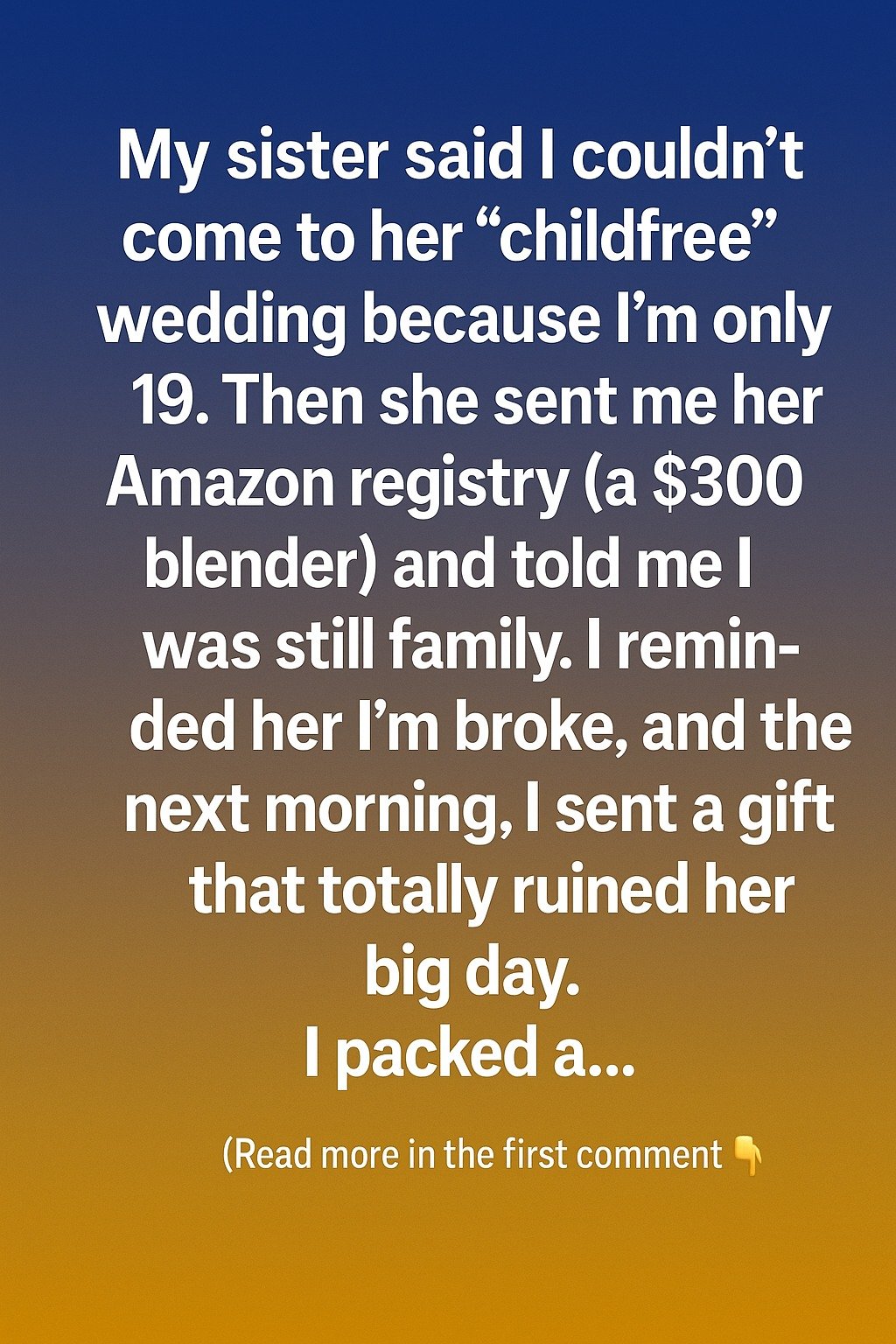 My sister told me I couldn’t come to her “childfree” wedding because I’m only 19. It stung because I’ve always been close to her and was excited to share in her big day. A few days later, she sent me her Amazon registry, which included a $300 blender, and said, “You’re still family, so of course, I expect a gift.” I was shocked.