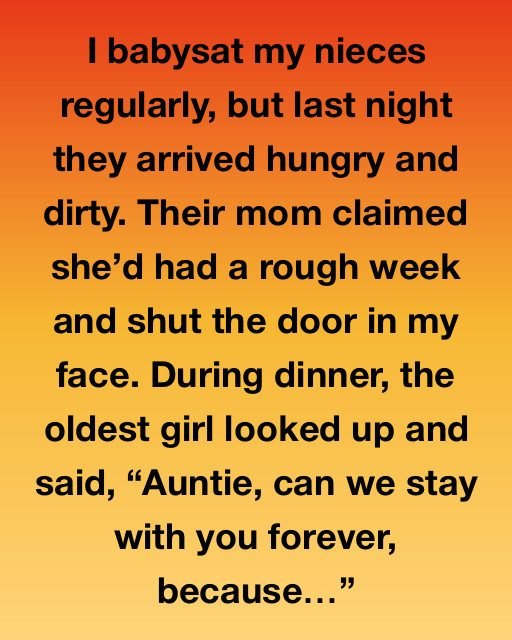 I babysat my nieces regularly, but last night they arrived hungry and dirty. Their mom claimed she’d had a rough week and shut the door in my face. During dinner, the oldest girl looked up and said, “Auntie, can we stay with you forever, because we’re happier here?”