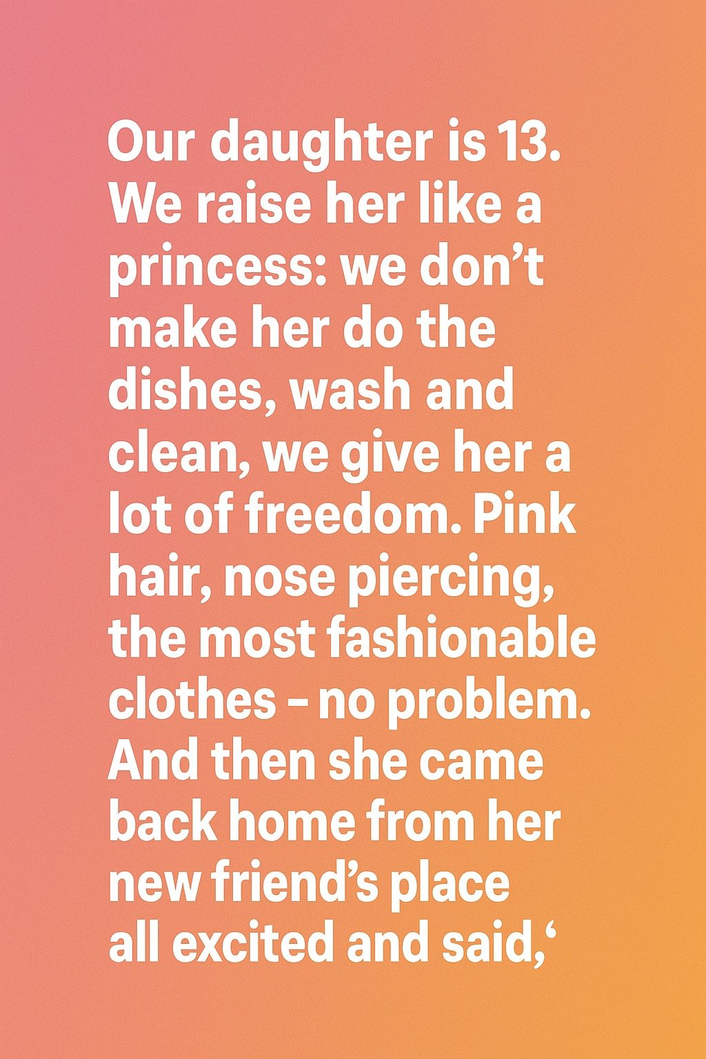 Our daughter is 13. We raise her like a princess: we don’t make her do the dishes, wash and clean, and we give her a lot of freedom. Pink hair, a tiny nose piercing, the most fashionable clothes — no problem.