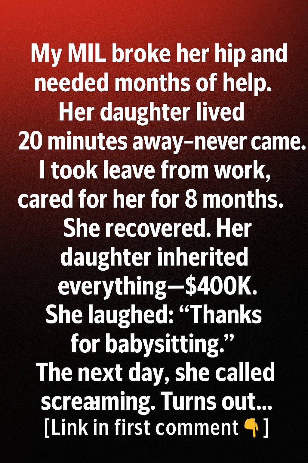 My MIL broke her hip and needed months of help. Her daughter lived only twenty minutes away but always had a reason she couldn’t come—meetings, errands, or simply “bad timing.” I tried not to judge, but every time I watched my mother-in-law struggle to sit up or reach for her walker, it became harder to ignore the silence from the person she had always described as her “closest companion.” When the doctor explained she would need constant support during recovery, I made the difficult decision to take leave from work. It wasn’t easy, and the days were long, but helping her felt like the right thing to do.