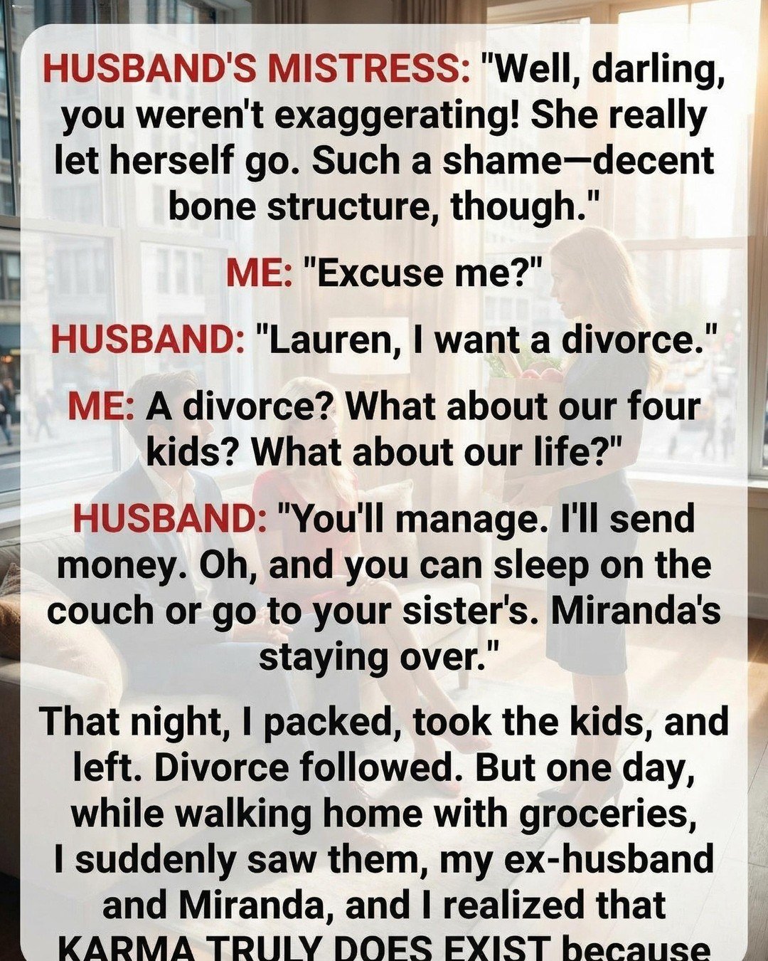ME: “A divorce? What about our four kids? What about our life?” HUSBAND: “You’ll manage.