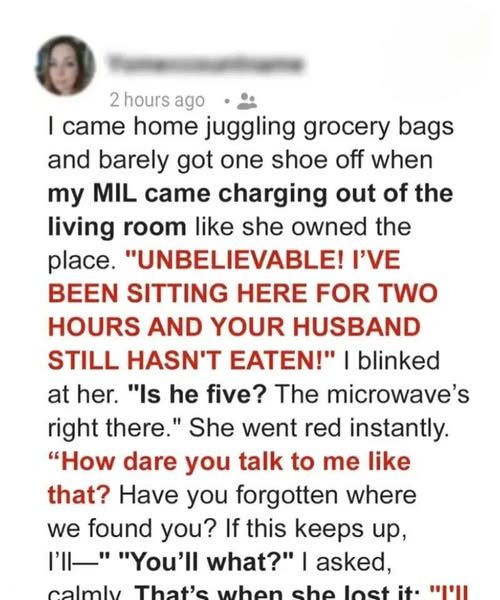 I came home juggling grocery bags and barely got one shoe off when my MIL came charging out of the living room like she owned the place.
