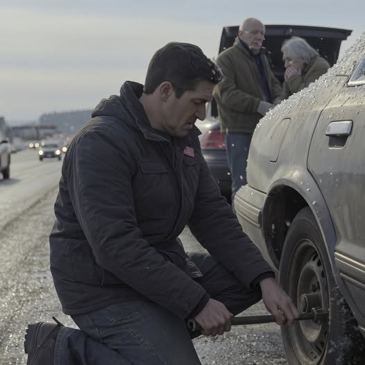 His grip was firmer than I expected, his eyes a clear, sharp blue that locked onto mine like he’d trained himself to look people directly in the face. I knelt beside the ruined tire.