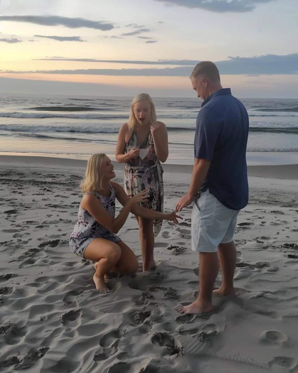 Suddenly, a figure appeared in the dimming light, running towards us. Before I could process what was happening, a woman in a white swimsuit dropped to her knees in front of John.