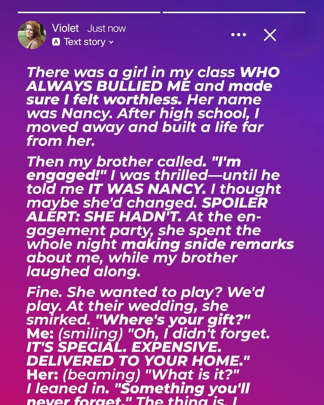 After graduation, I ran from my past, moving to a new city, starting over. For years, I built a life where Nancy’s name was nothing but a distant, ugly memory. But that all shattered when my brother called with the news. “I’m getting married!” he exclaimed. “Her name’s Nancy!” The moment I saw her at the engagement party, that familiar smirk took me straight back to the girl who made my life miserable. Nothing about her had changed — only now, I was trapped in a room full of people.