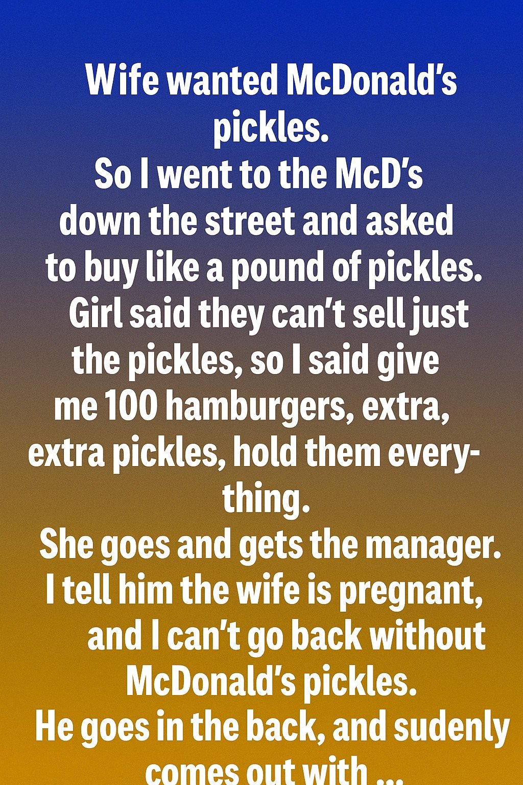 Determined to bring a smile to my wife’s face, I jokingly said, “Okay then, give me 100 hamburgers with extra pickles, and hold everything else.” The cashier looked puzzled and went to get the manager.When the manager arrived, I explained the situation: “My wife is pregnant, and she’s been craving McDonald’s pickles. I really don’t want to go home without them.”