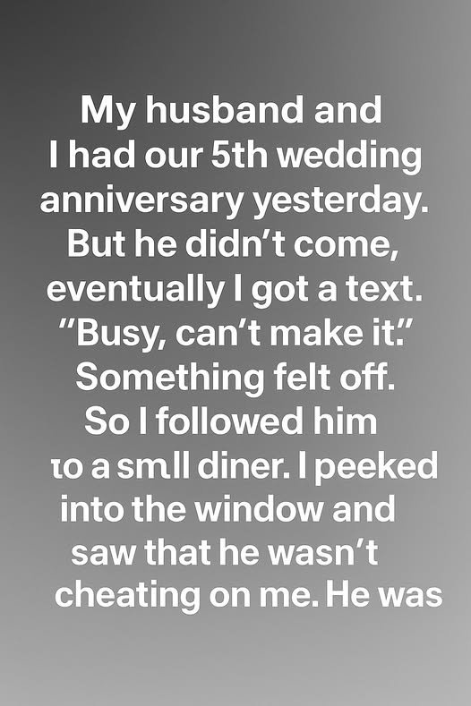 Something about his message felt off and unsettled me deeply. The next day, my curiosity and concern got the better of me, so I decided to follow him. I saw him enter a small, quiet diner and my heart pounded as I peeked through the window.