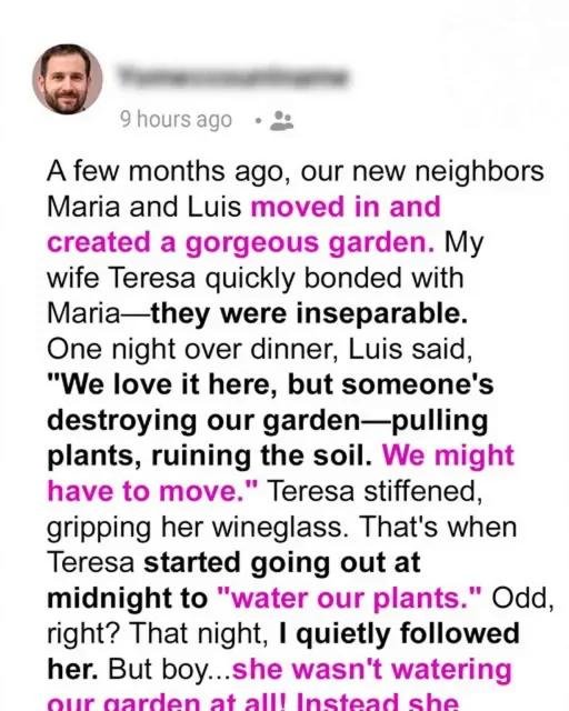 When our new neighbors, Maria and Luis, moved in, we quickly became close. They transformed their garden beautifully, but soon, plants started mysteriously getting destroyed. Around that time, my wife Teresa began watering our garden at midnight, which felt strange but harmless.
