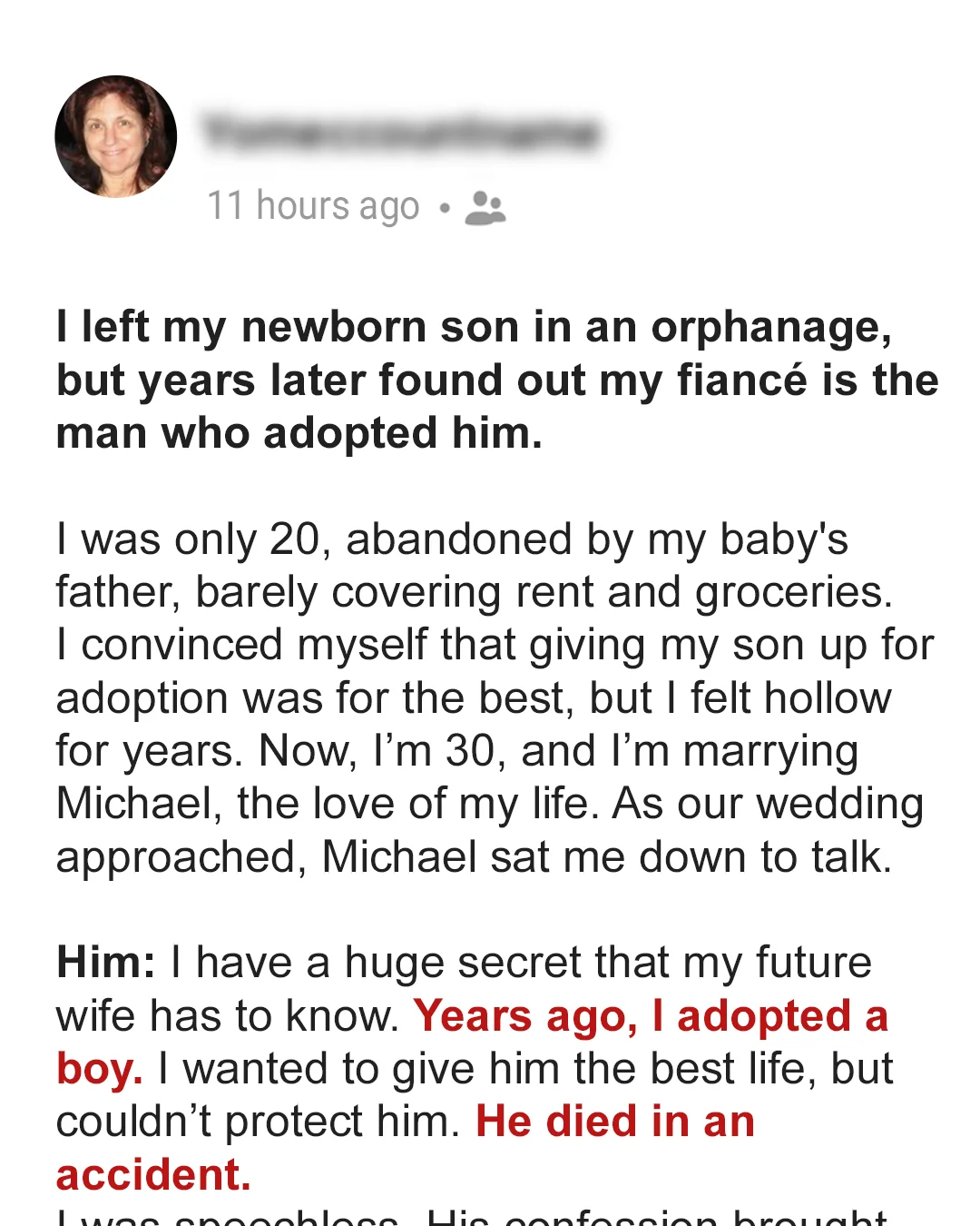 I didn’t know what Michael was about to tell me. I just knew that when he was done, I had no choice but to tell him about my son. “Julia,” he said, “Years ago, Kelly and I adopted a child before Sarah and David were born.