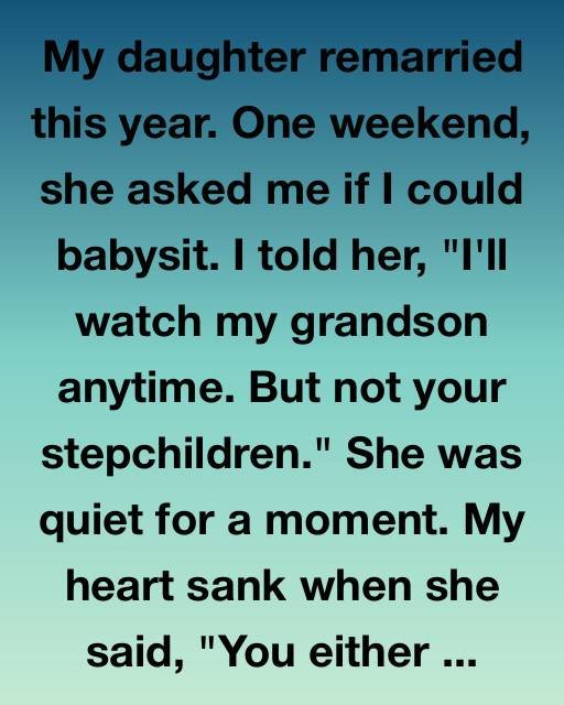 But not your stepchildren.” She was quiet for a moment. My heart sank when she said, “You either babysit all of them, or none of them.”